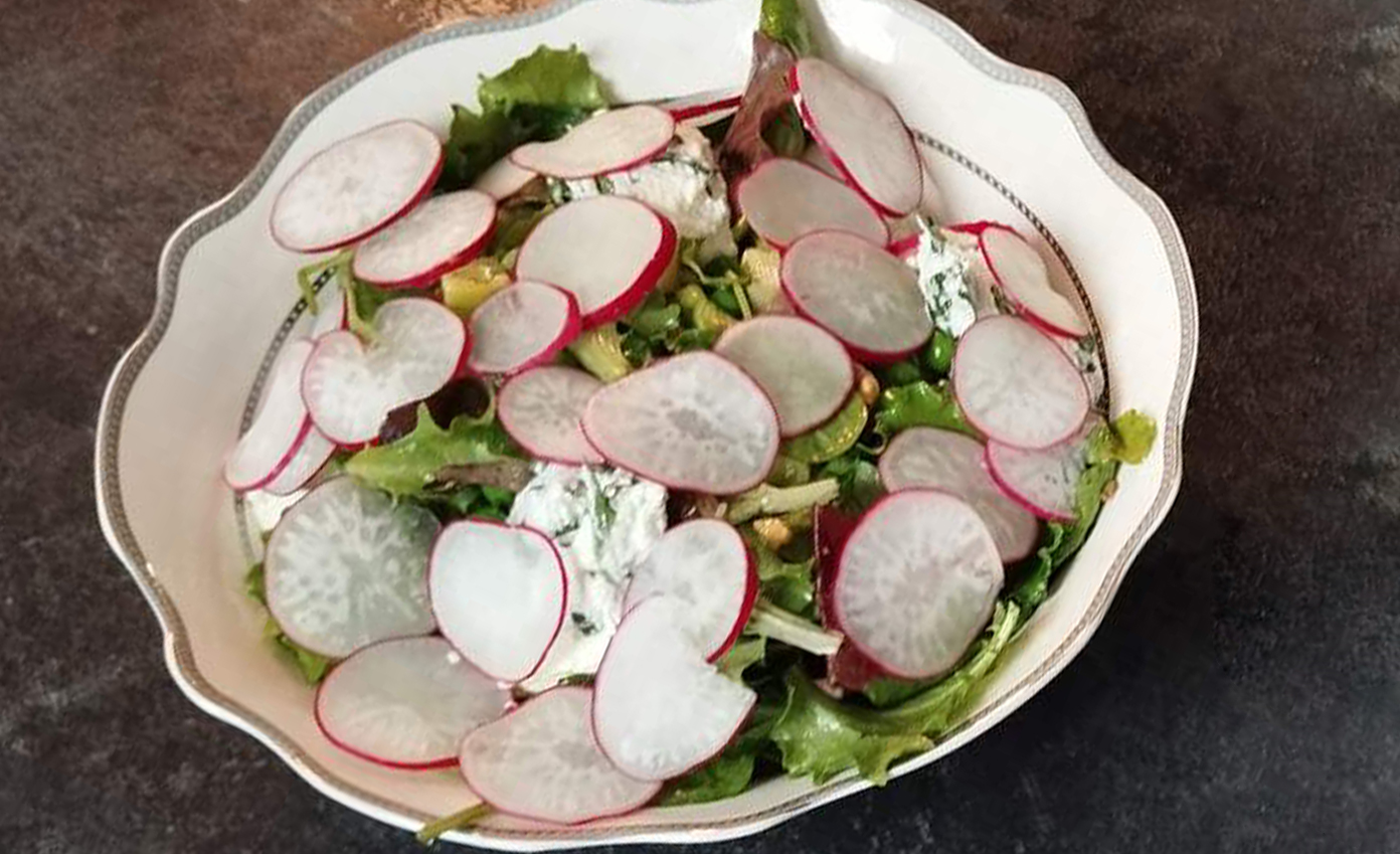 potom salatu, od gore još 2-3 kanela, i završite sa hrskavim rotkvicama.