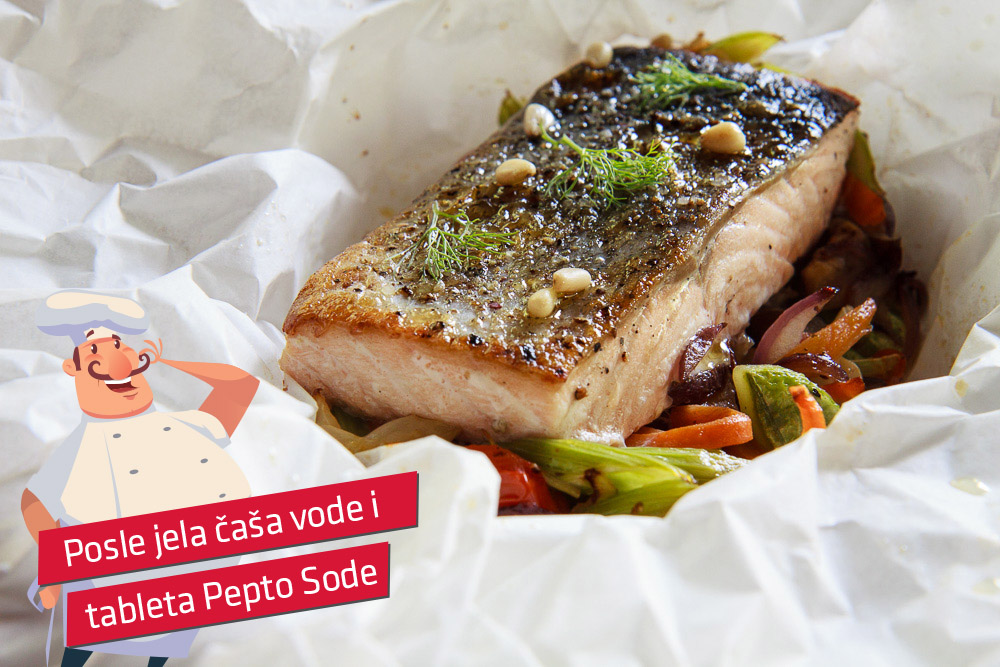 Losos posle pečenja kožice staviti na povrće, staviti preko pinjole i preliti belim vinom. Napraviti vrećicu (skupiti krajeve pek papira) i zatvoriti.